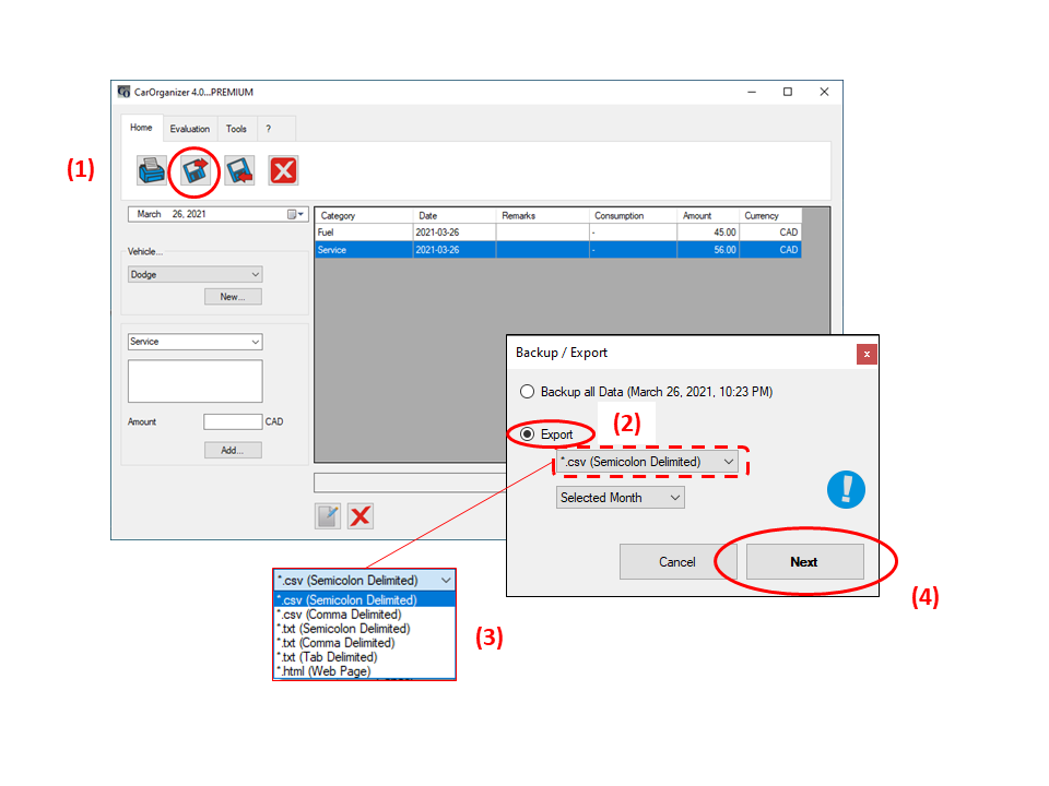 To export your data into universally useable formats, follow these steps...(1) - click the Export button in the Home menu...the Backup / Export window will open. (2) - select the option Export...