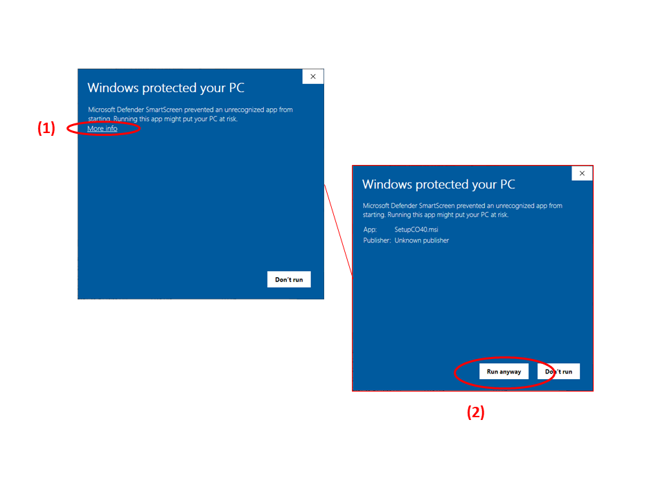 In the case that MS Windows flags the application as a potential threat during installation...(1) - click More info in the installation dialog and then (2) - click the button Run anyway to start the installation process.