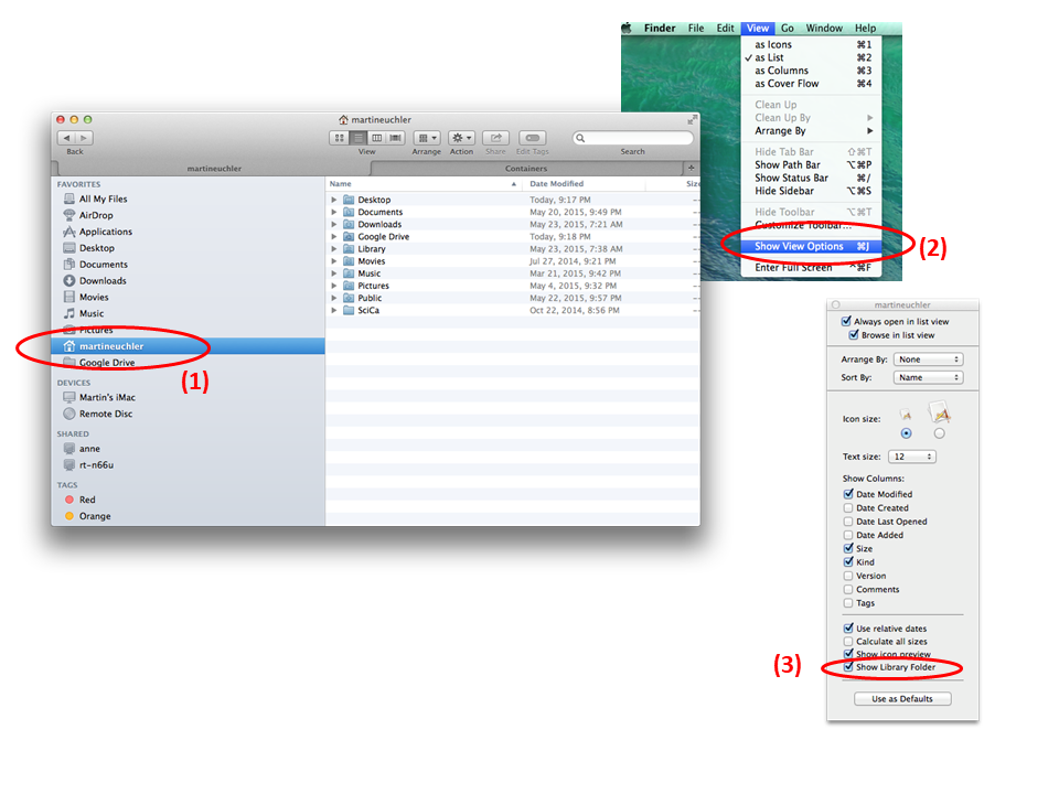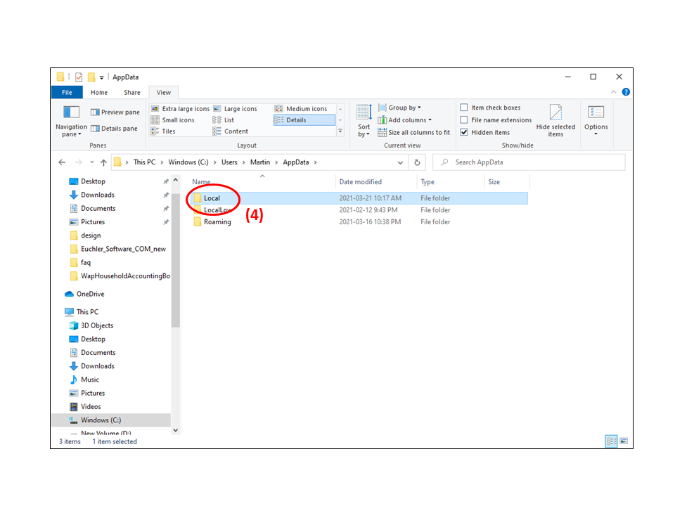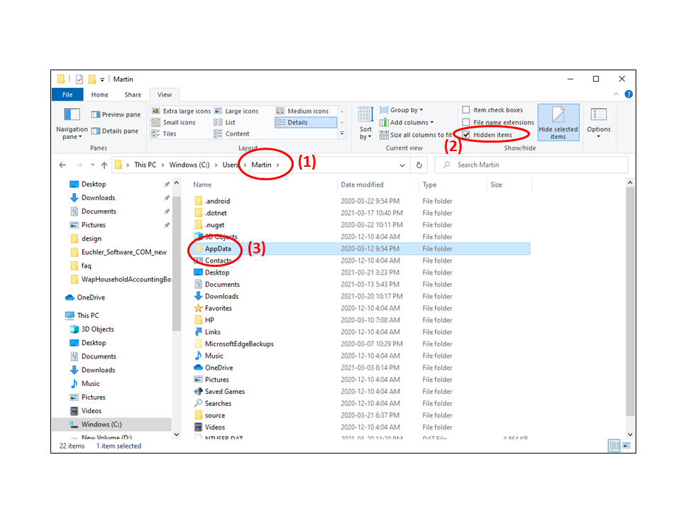 (1) - Select your usernames folder on your main hard drive. (2) - ensure that the check box Hidden items is activated in the View menu. (3) - Find and double-click the folder AppData...