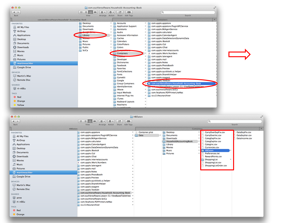 In the sub folder "Containers" you will find the folder "com.euchlersoftware.Household-Accounting-Book". Your data is saved in the sub folder "Data/HouseholdAccountingBook". It is beneficial to save this folder from time to time to a different drive (e.g. USB stick) to create a manual backup.