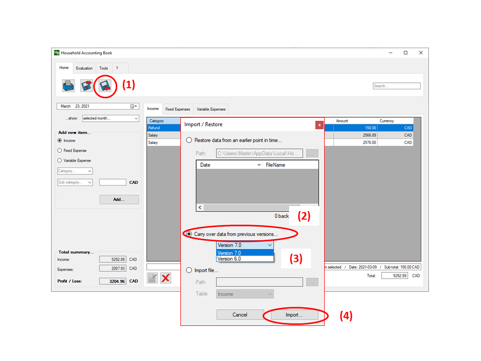 After installation and start of the software, (1) - press the Import button in the main menu. (2) - select Carry over data from previous versions... and (3) - select the from which version (6.0 or 7.0) you would like to import. (4) - Click the Import button...
