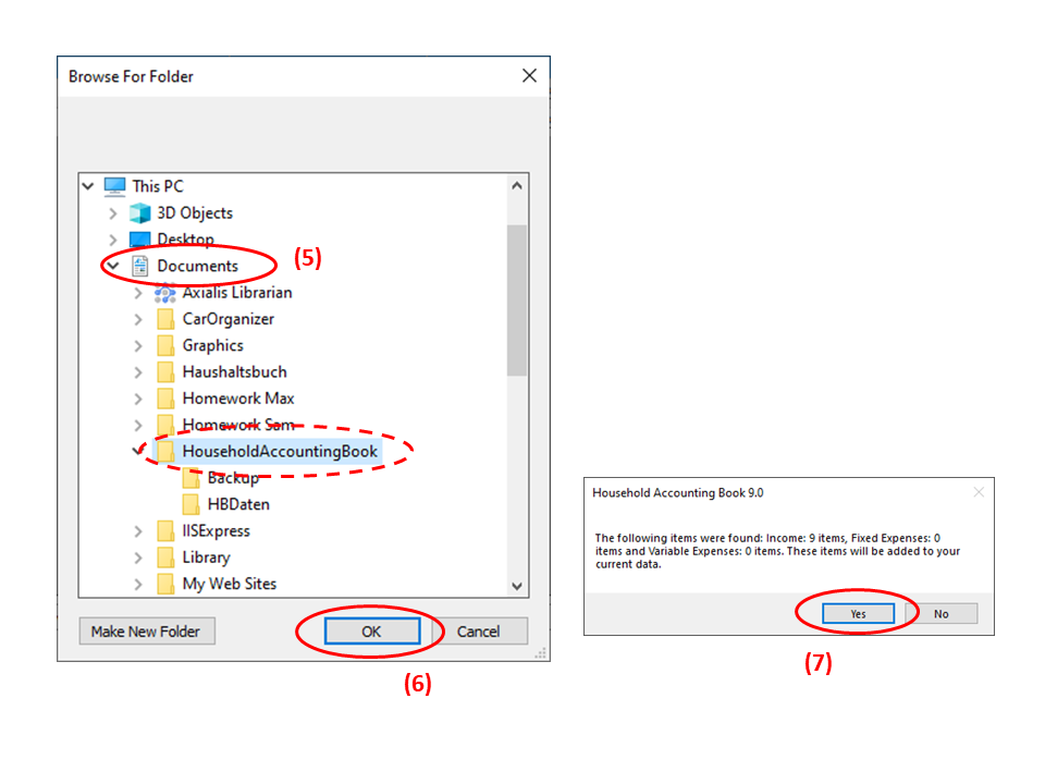 The folder selection window will appear...(5) - select the folder your existing data is stored in. Note: in case of a previous standard installation of Version 6.0 or 7.0, you can simply select your personal Documents folder...the import routine will determine the rest of the location.