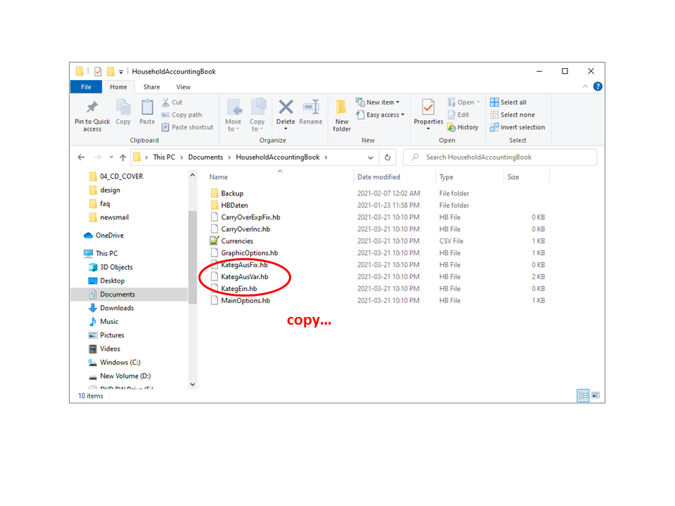 To carry over categories from the older version, the files have to be copied manually to the corresponding location. The files for version 7.0 are located in your personal Documents directory - sub folder HouseholdAccountingBook.