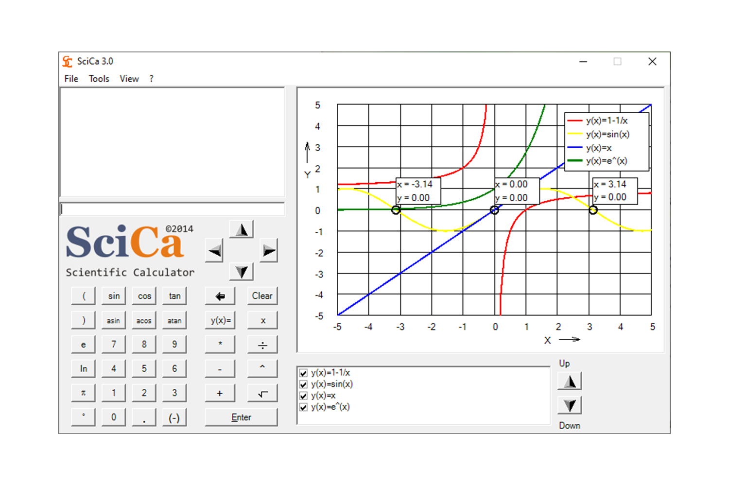 SciCa 3.0 is a scientific calculator, which is able to evaluate complex mathematical expressions. In addition, this software enables you to visualize two-dimensional functions (y=y(x)-functions) graphically. To learn about all the features this software has to offer, please refer to the